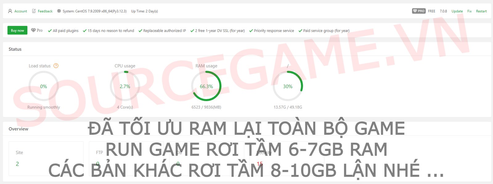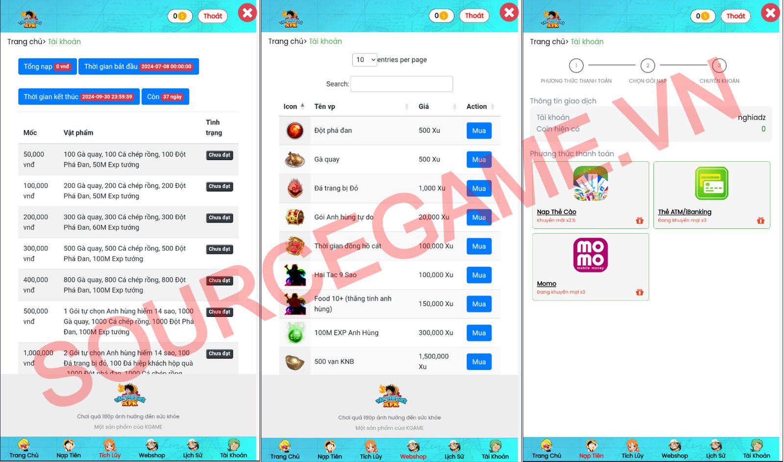 Mô tả: MÃ NGUỒN BAO GỒM SERVER ĐÃ TỐI ƯU RAM, WEB USER, WEB ADMIN, NỀN GM, CÓ CLIENT APK, CÓ LIÊN SERVER, VĂN BẢN HƯỚNG DẪN CÀI ĐẶT, VĂN BẢN HƯỚNG DẪN MỞ SERVER MỚI, MÃ NGUỒN CHẠY TRÊN VPS CENTOS